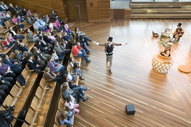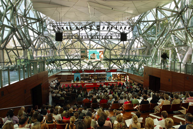 A seated audience of mostly middle-aged men and women watch a cooking demonstration on stage at Deakin Edge.