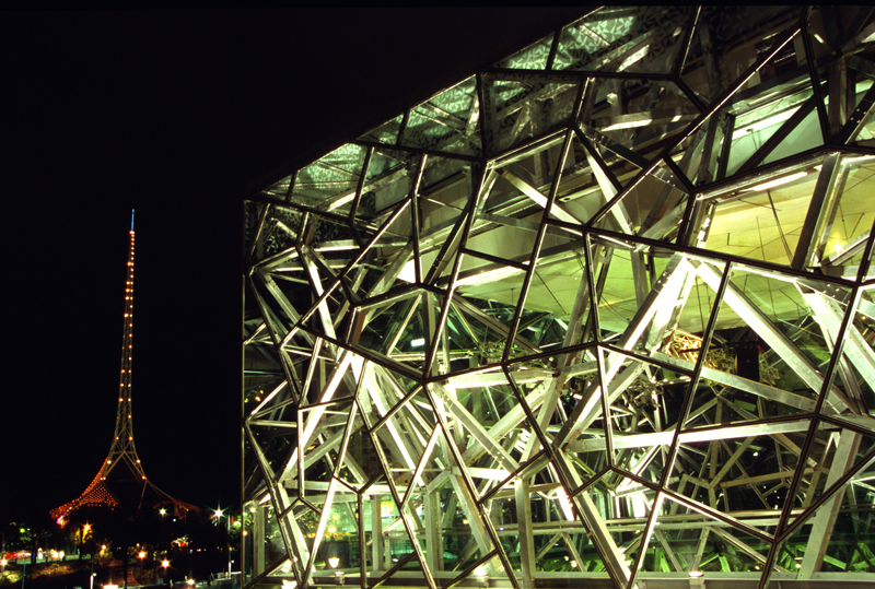 Exterior of the Deakin Edge building at night. The fragmented glass and steel construction is lit from below.