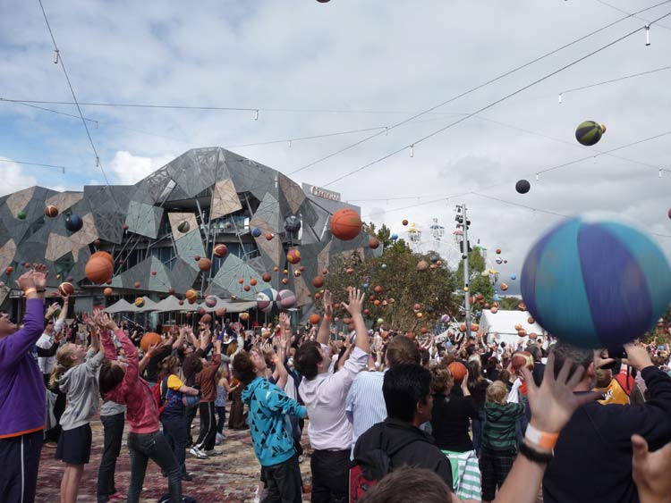 Hundreds of teenagers and young adults simultaneously throw basketballs into the air in Federation Square.