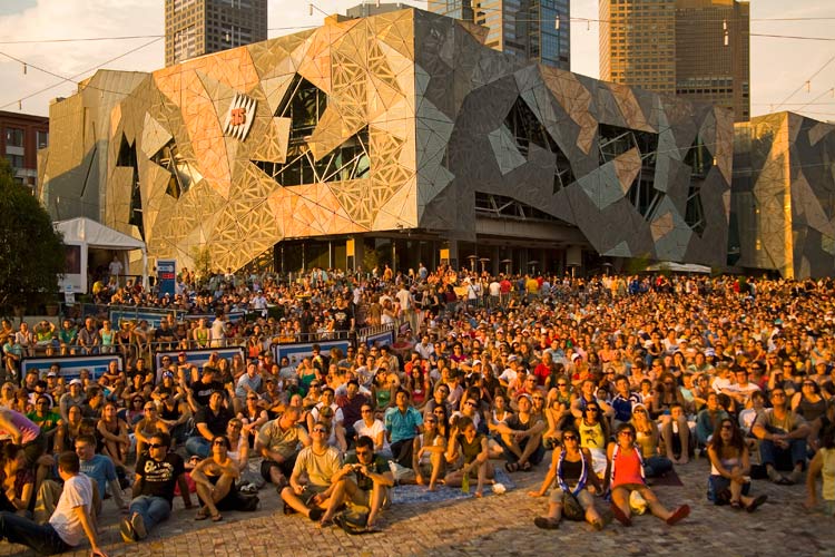 Hundreds of people seated on the ground at sunset in Federation Square watching a show.