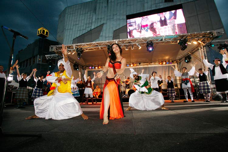 Dancers in a variety of national costume dance in front of an open-air stage outside the ACMI building.