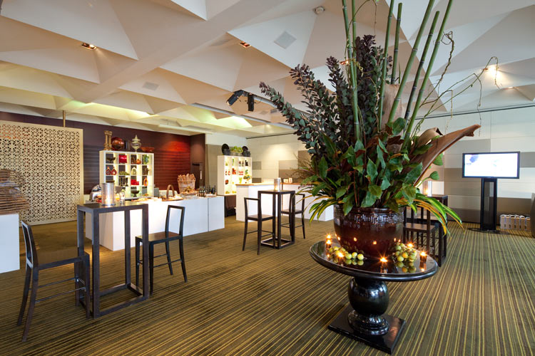 Inside ZINC Function Centre. Arrangements of plants offset the sharp lines and angles of the modern restaurant setting.